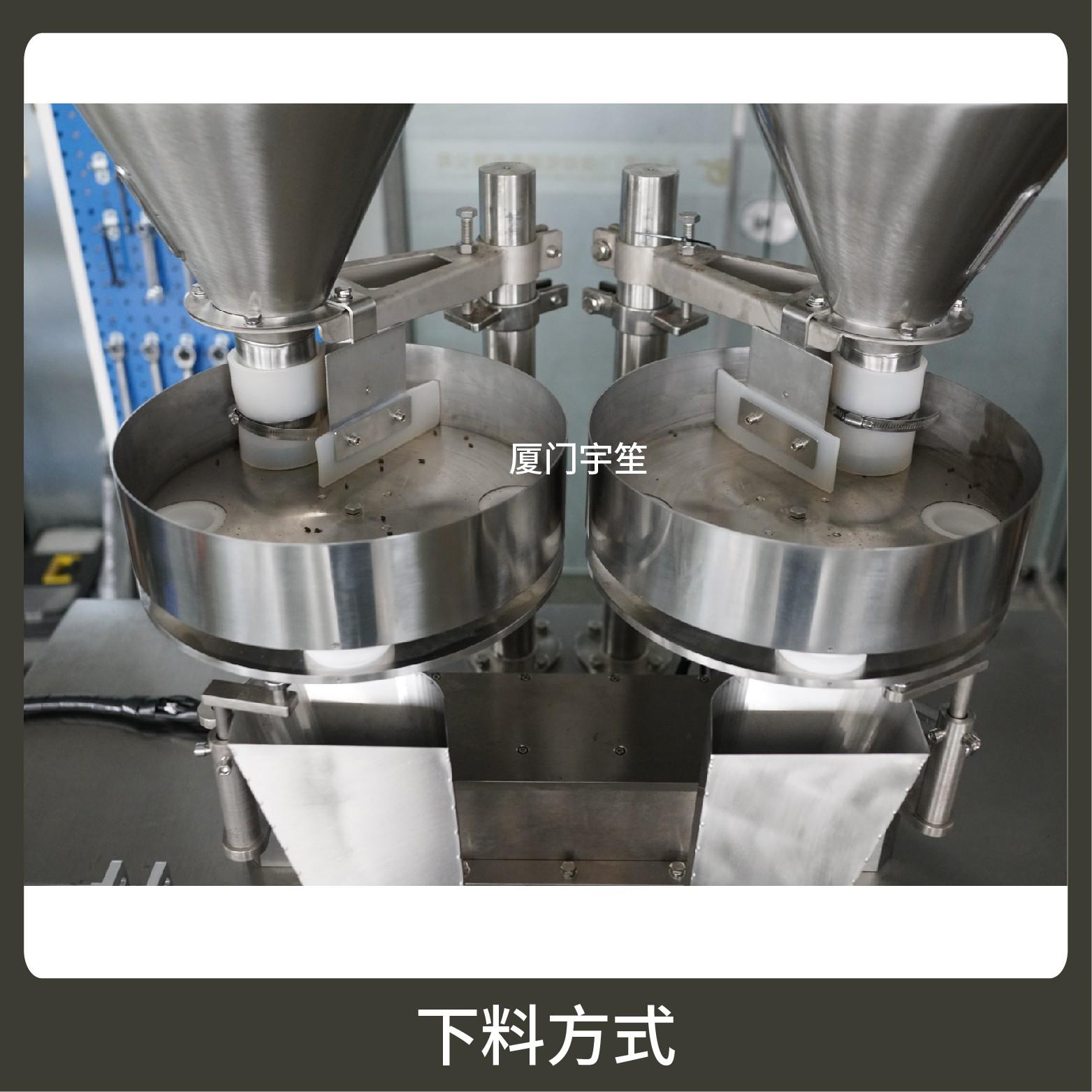 1、成品雙出,速度快,包裝流程全自動(dòng),無需人工操作??筛鶕?jù)充填物料的性質(zhì)選配不同的下料結(jié)構(gòu)。